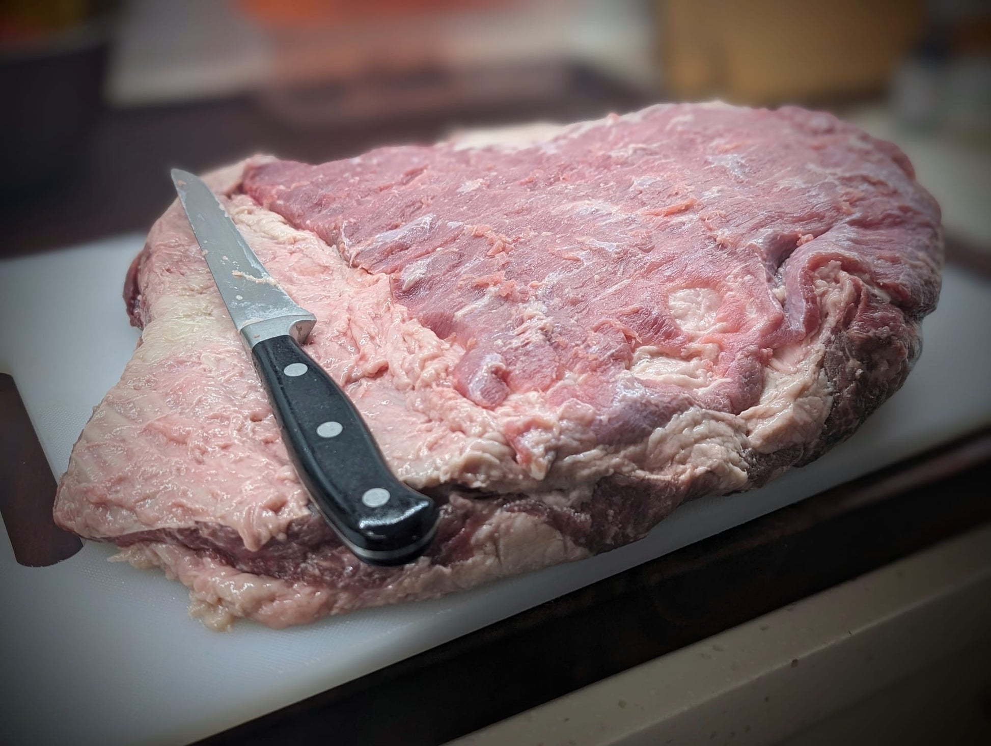 PE brisket which has both the Point and the Flat, same packing spec as a US Packer brisket. It's untrimmed with a layer of fat.