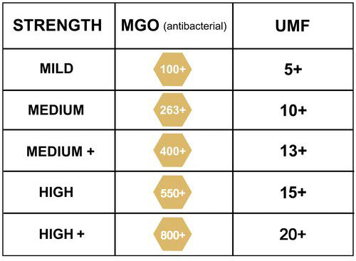 UMF™ 10+: our certified UMF™ 10+ Mānuka Honey is independently tested and verified by internationally accredited laboratories (containing at least 265mg/kg Methylglyoxal - MGO). The UMF™ grading system appraises natural markers found in Mānuka honey, and assures purity and quality.