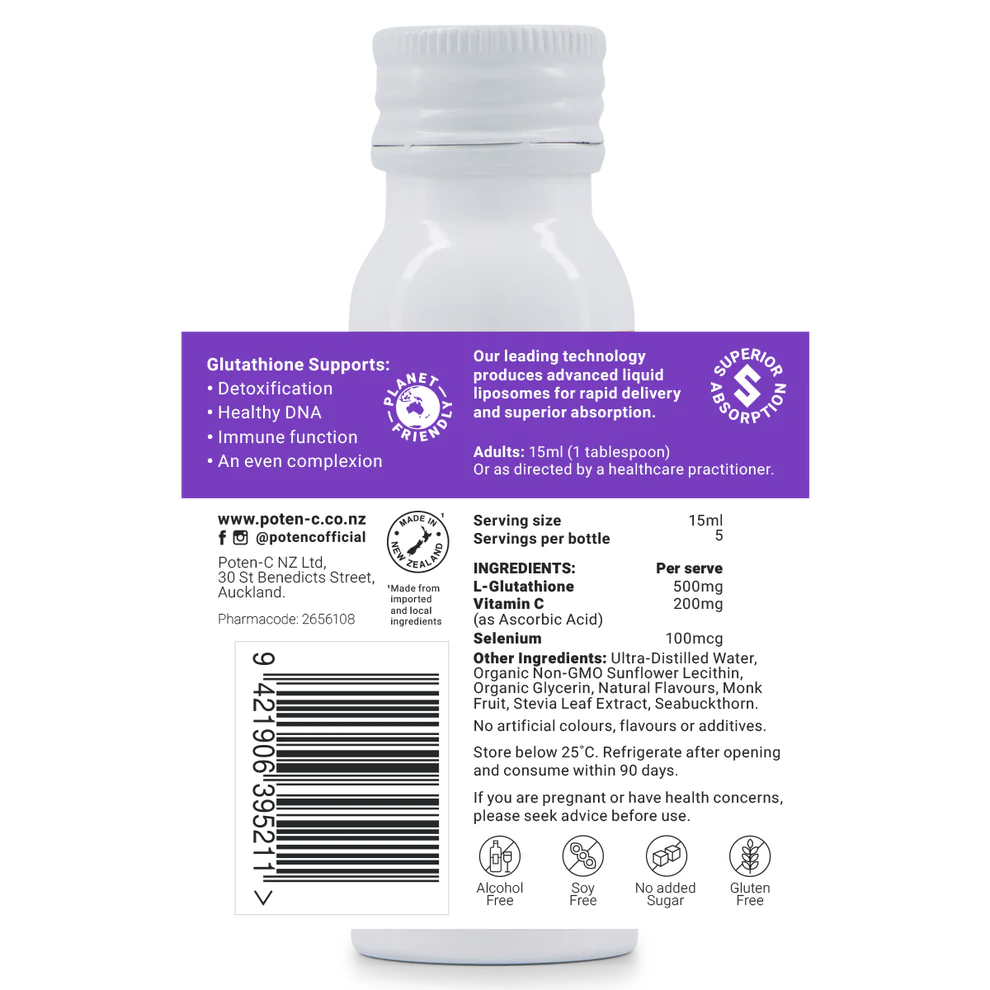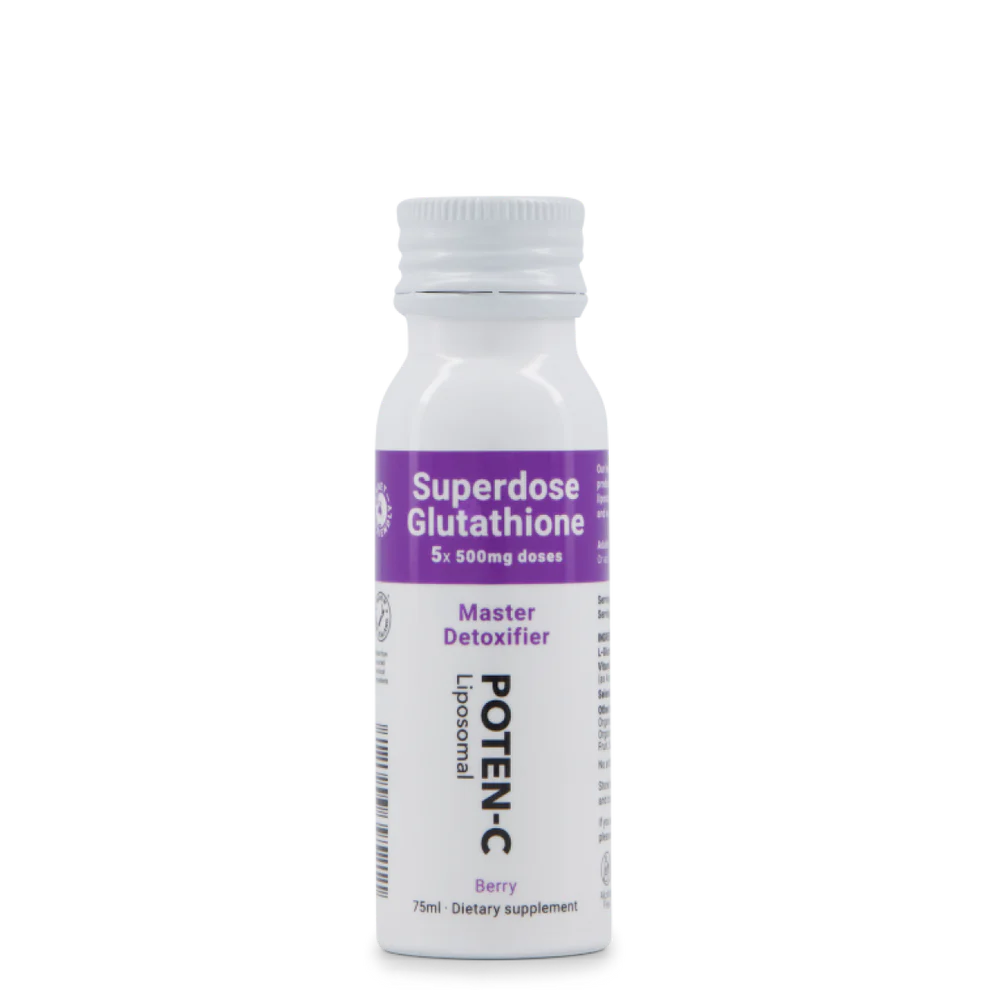 Poten-C’s optimal sized liquid liposomes (Berry flavour) overcome the disadvantage of standard GSH supplements, which are often poorly absorbed. The active ingredients are cleverly encased in an organic, non-GMO phospholipid ‘bubble’, proven to improve blood levels of this master antioxidant.