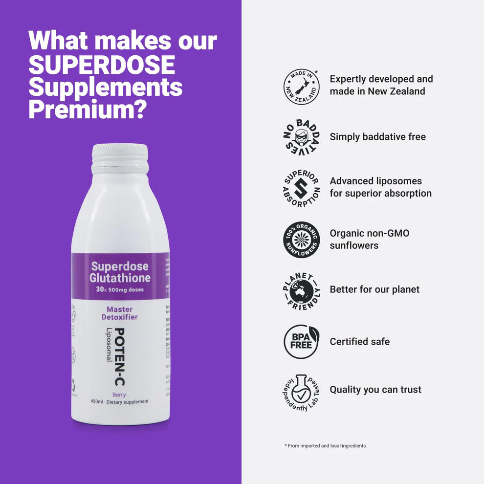 Superdose Liposomal Glutathione (GSH) is developed in New Zealand with care, for those who prefer a premium, high strength, ‘no baddatives’ formula. Containing 500mg of Glutathione enhanced by Selenium and Vitamin C for powerful immune, detox and skin support. 15ml = 500mg, 15ml is 1 Tablespoon or 1 Teaspoon is 5ml.