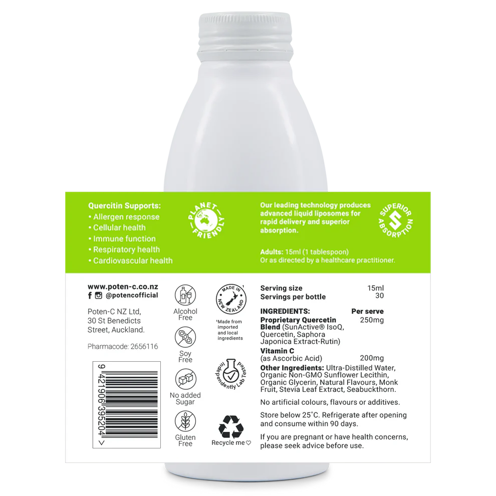 Poten-C combines a patented form of Quercetin, Sunactiveᴿ IsoQ, with advanced liposomal technology to ensure maximum bioavailability of this exceptional supplement. Specifically, Sunactiveᴿ IsoQ provides up to 25x the bioavailability of standard Quercetin and Poten-C’s liquid liposomes are in the ‘gold standard’ size range for maximum absorption.