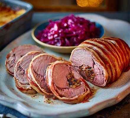Stuffed saddle of venison with prunes & brioche